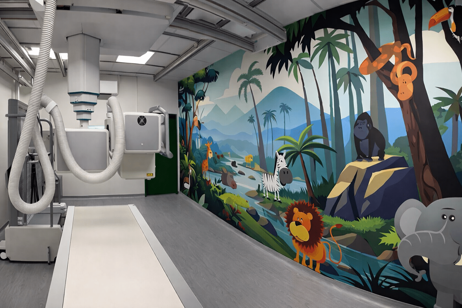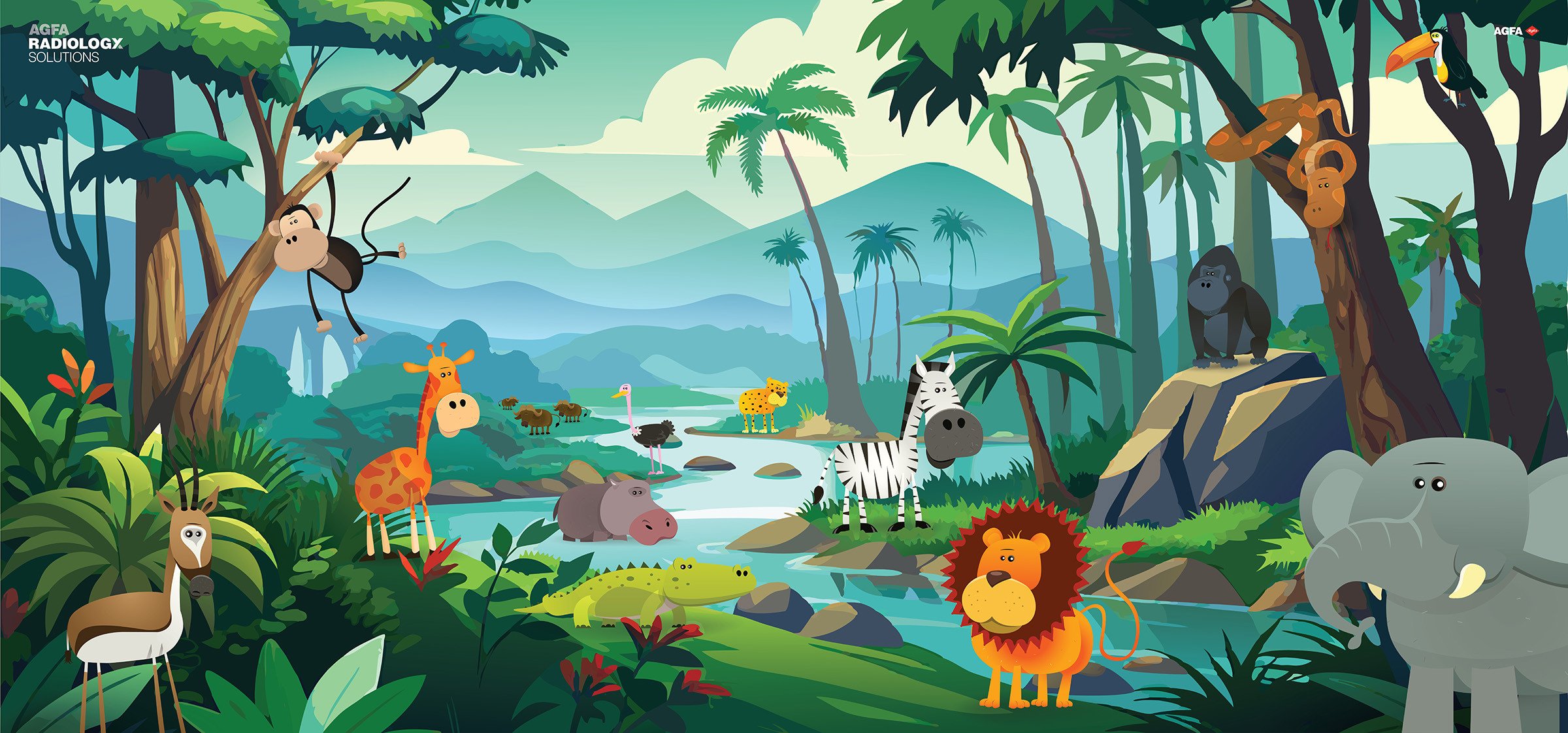 In opdracht van Agfa Radiology Solutions mochten we een hartverwarmend project realiseren voor een kinderziekenhuis in Griekenland: het ontwerp voor een grote jungletekening voor één van de muren. Het doel was om een vriendelijke, geruststellende omgeving te creëren die kinderen helpt om te ontspannen tijdens medische onderzoeken of behandelingen.