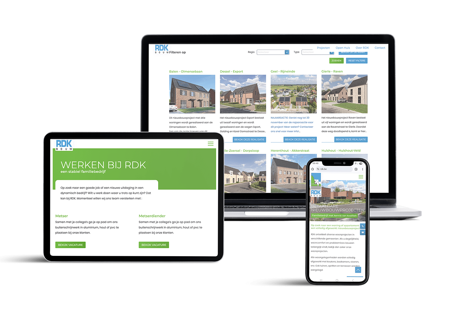 De website van RDK is lang niet alleen bedoeld als online visitekaartje. Bezoekers vinden er meer informatie over de actuele bouwprojecten. Wie op zoek is naar een woning of een handelspand, kan uit het ruime aanbod van RDK selecteren op basis van regio en type, of gebruikmaken van de handige kaart waarmee je heel precies kan zoeken op locatie.