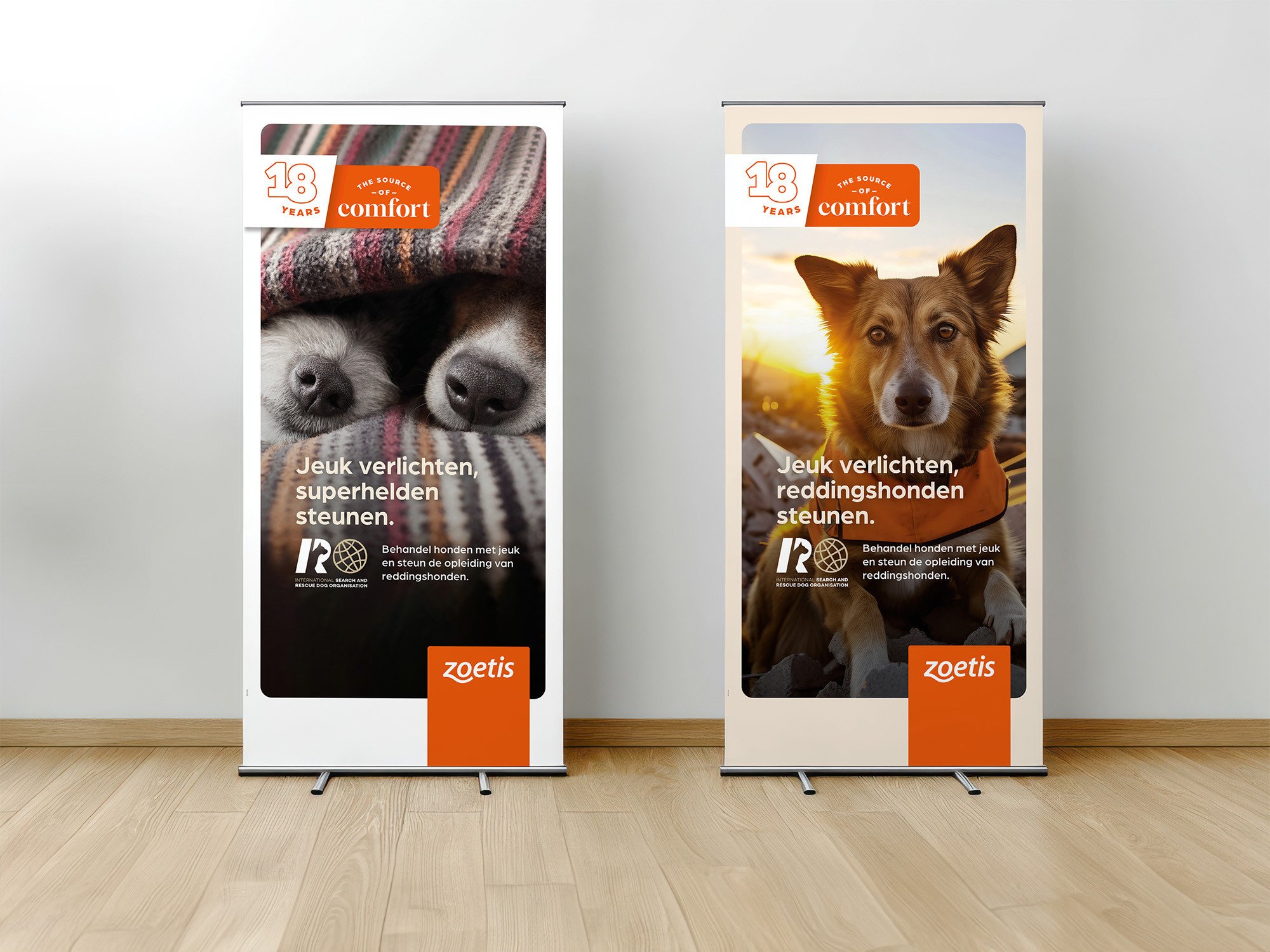 We bedachten een opvallende toonbankdisplay die meteen in het oog springt en het campagneverhaal duidelijk overbrengt. Een brochure, roll-ups voor wachtzalen en evenementen en een reeks banners op social media maakten het verhaal compleet. Resultaat? Een consistente, hartverwarmende campagne die dierenartsen ondersteunt en baasjes inspireert om hun Kleine Helden de juiste start te geven.